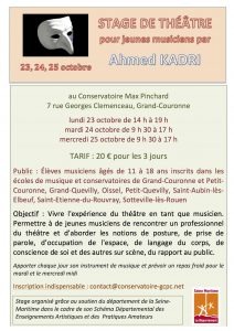 Il sera encadré par le comédien Ahmed Kadri et aura lieu au conservatoire de Grand-Couronne les 23, 24 et 25 octobre 2017.